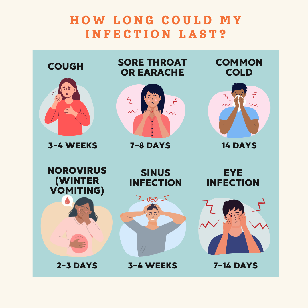 The guide below outlines the typical recovery times for common illnesses such as coughs, colds, sore throats, sinus infections, and more.